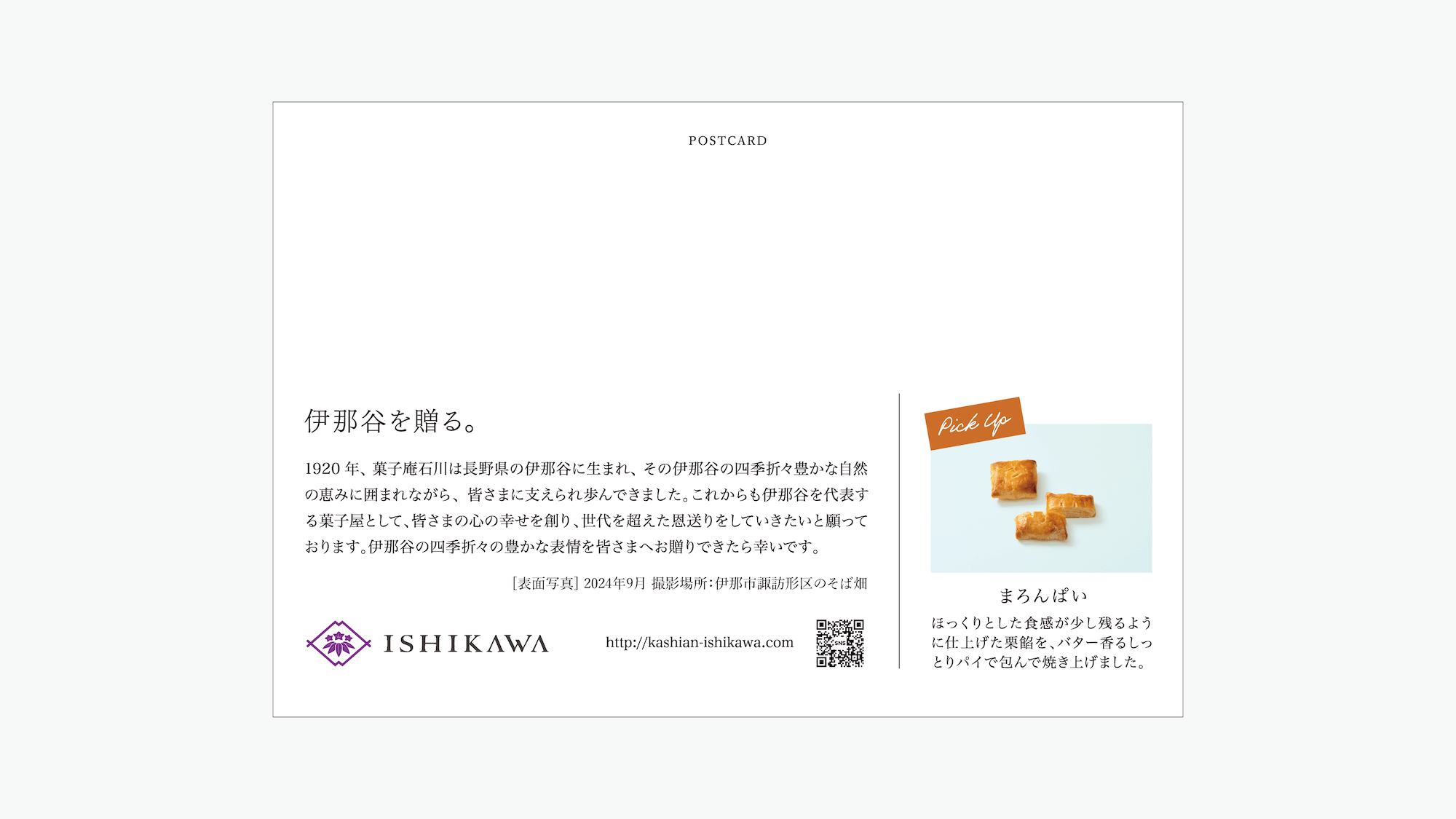 TOP > WORKS > PHOTO > ISHIKAWA | Seasonal Gift Postcard Vol.38 ISHIKAWA | Seasonal Gift Postcard Vol.38 ISHIKAWA 菓子庵石川 PHOTO DESIGN #ISHIKAWA#postcard 菓子庵石川 | シーズナルギフトポストカード 38 |写真 デザイン シーズナルギフト- SEASONAL GIFT-Vol.39-2024年09月 RELATED Design/Art Collection